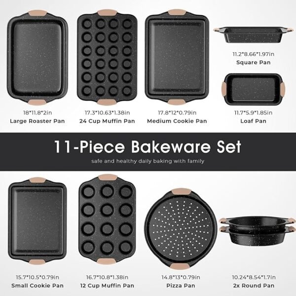• 11-Piece Versatile Set: Includes 2 cookie sheets, 1 roasting pan, 2 muffin pans, 2 pie pans, 1 square pan, 1 pizza pan, and 2 loaf pans—everything needed for everyday baking.