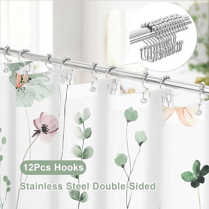 3-in-1 Shower Curtain Set, Sage Green Watercolor Floral Fabric with PEVA Liner & Steel Hooks, 72×72