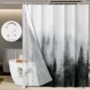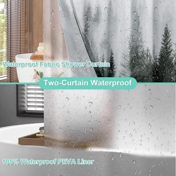 Complete 3-in-1 Set: Includes 1 misty forest fabric shower curtain, 1 clear PEVA waterproof liner, and 12 double-sided metal hooks with reinforced grommets for secure hanging.