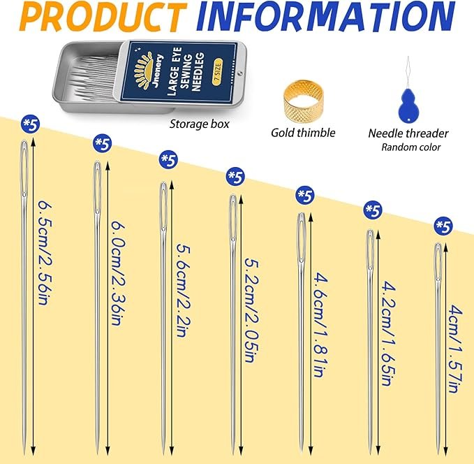 35PCS Large Eye Needle Set – Includes 35 needles in 7 different sizes, plus a needle threader and thimble for versatile hand sewing projects.