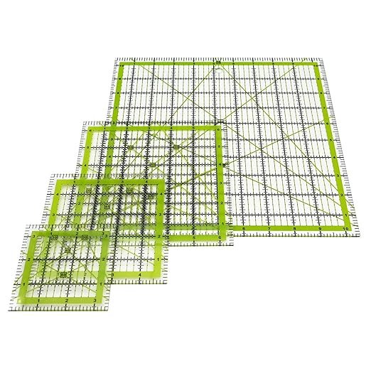 - Set: This quilting ruler set includes 4 square rulers in different sizes (3.5” x 3.5”, 5” x 5”, 6.5” x 6.5”, 10.5”x 10.5”)
