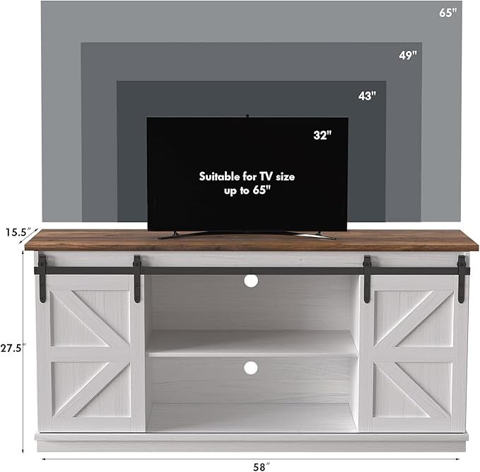Farmhouse Wood & Metal Design: Supports TVs up to 65″ and also works as a stylish storage cabinet for décor and photos.