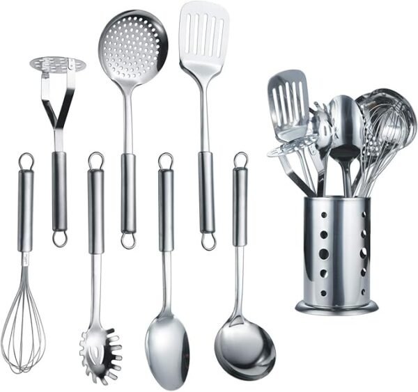 Complete 8-Piece Set: Includes ladle, skimmer, slotted turner, pasta server, serving spoon, potato masher, egg whisk, and holder