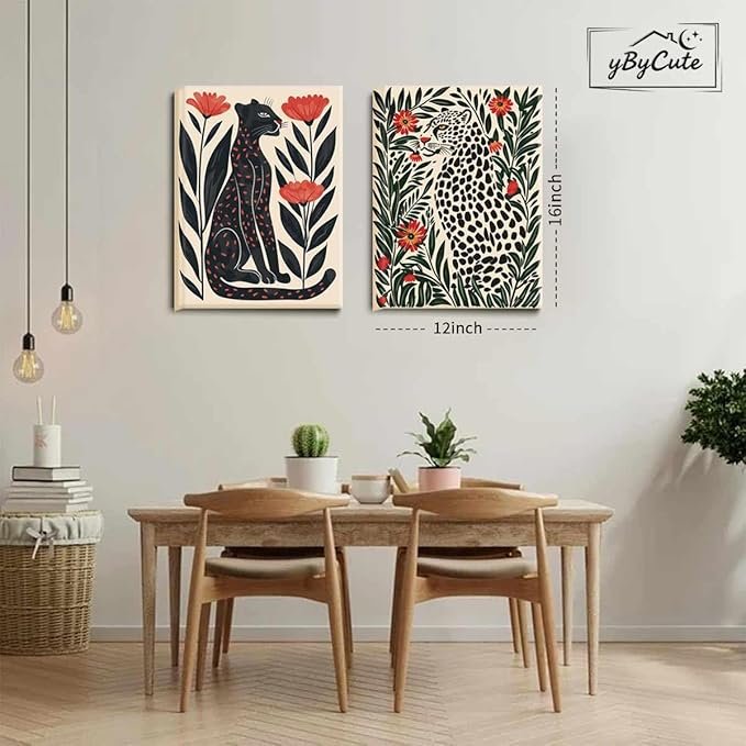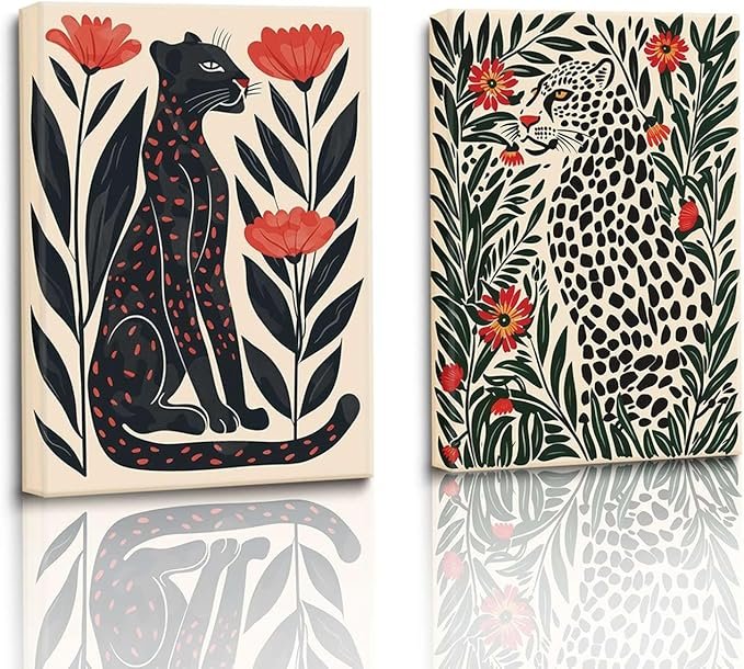 • Bohemian Cheetah Wall Art: Features bold leopard imagery with red florals, blending mid-century, Matisse, and op-art elements for a stylish, modern aesthetic.