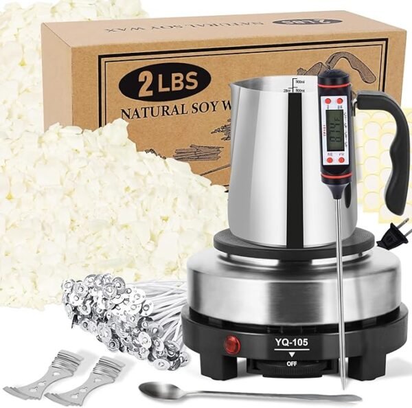Complete Candle Kit: Includes electric hot plate, 2 lbs soy wax flakes, 50 cotton wicks, 32oz stainless steel melting pot, centering devices, spoon, thermometer, and 60 wick stickers—ideal for beginners.