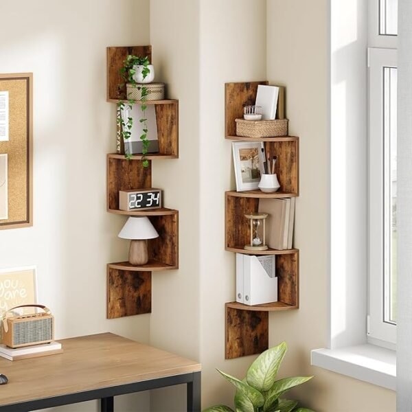 • Space-Saving Design: Each floating corner shelf features 4 tiers spaced 7.9″ apart, maximizing unused wall corners to neatly display books, photos, plants, and décor.