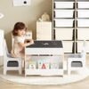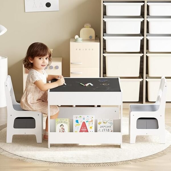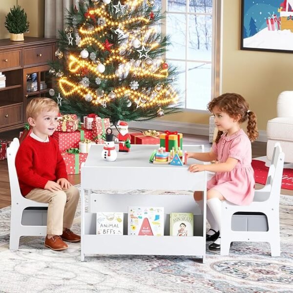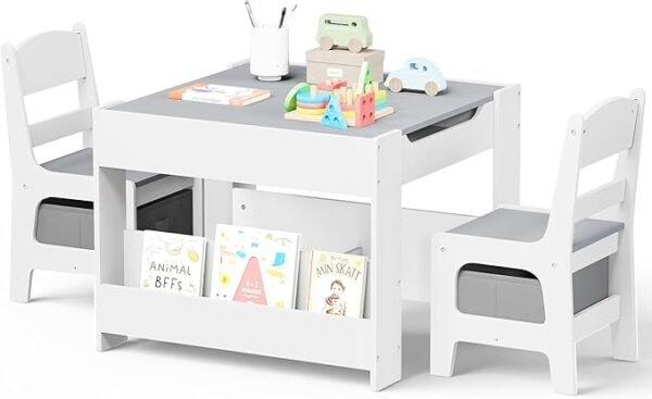 • 4-in-1 Table & Chair Set – Features a reversible desktop with a whiteboard for drawing/reading and a chalkboard on the back. Remove the desktop for block play. Double-sided bookshelves keep books organized.