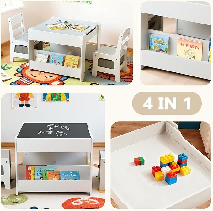 • 4-in-1 Table & Chair Set – Features a reversible desktop with a whiteboard for drawing/reading and a chalkboard on the back. Remove the desktop for block play. Double-sided bookshelves keep books organized.