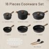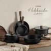 Set Includes: 8″ fry pan, 9.5″ fry pan, 2.5-qt saucepan with lid, 5-qt sauté pan with lid, 5-qt stockpot with lid, slotted turner, ladle, and 5 pan protectors.
