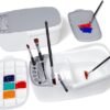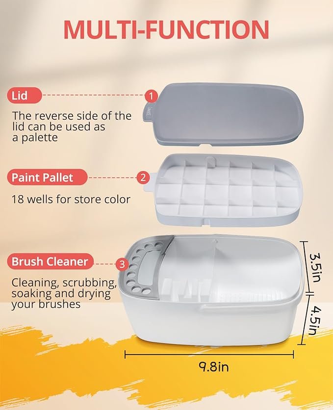 Multi-Functional Brush Cleaner – Includes a wash basin and palette lid with 18 paint wells for mixing and storage.