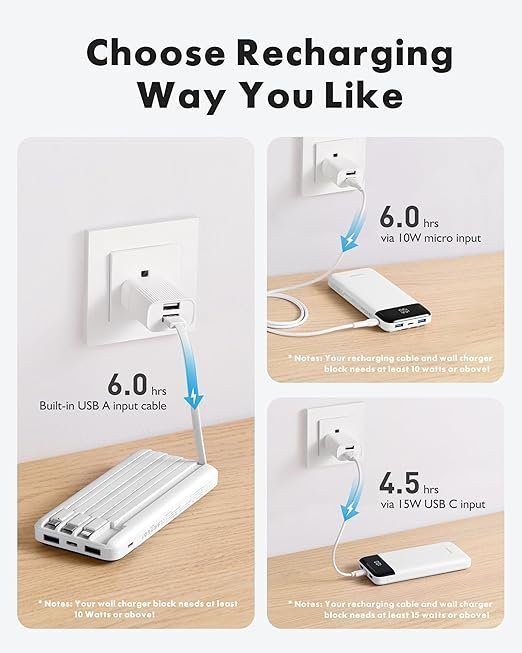 Charge Up to 6 Devices at Once: Features 3 built-in cables + 3 output ports for powering multiple devices simultaneously. Recharge the power bank through built-in cable, USB-C, or Micro-USB for maximum convenience.
